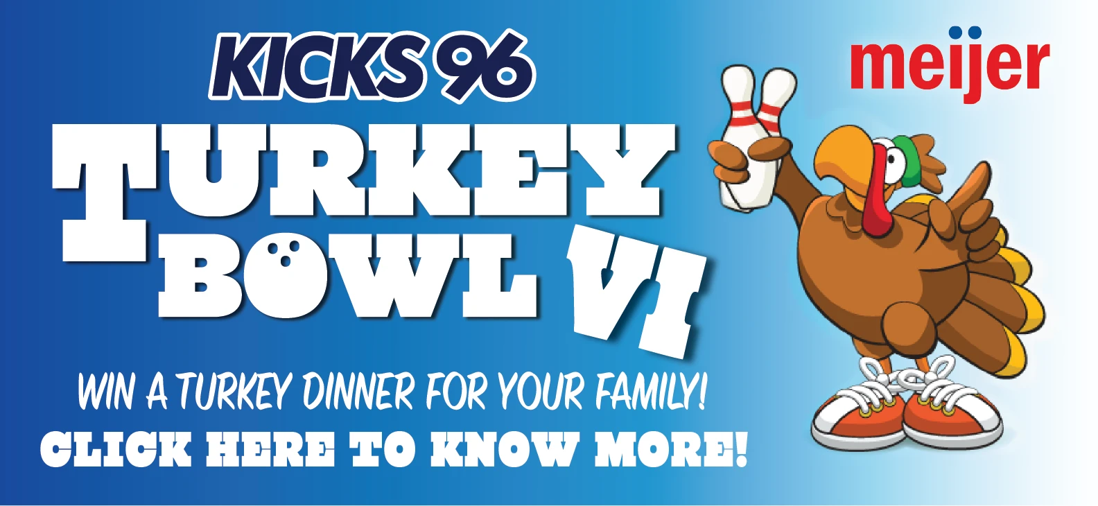 Tune in November 17-20 with the Kicks Morning Crew to qualify. Listen for a Turkey Call and we'll take caller 6 to join us for the finals bowling tournament! Finalists will meet at Meijer on November 21st at 12:00pm to bowl for their chance at winning all the fixin's for a turkey dinner for four. Each qualifier will leave with a prize! Bowl the highest score after three rounds and YOU WIN!